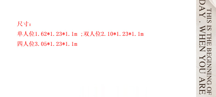 尺寸:单位沙发:1.62*1.23*1.1;二位沙发:2.10*1.23*1.1;四位沙发:3.05*1.23*1.1