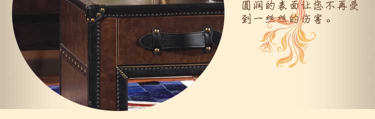 纯手工制作复古工艺。现代风格美观大气的外观是这款茶几的主打卖点,无可挑剔。茶几主体用实木制做,外面是皮革包覆着再衔接处是皮条固定,并用设计感十足的铆钉装饰固定,让茶几显得更加的有质感。怀旧、浪漫,升华品味,简洁而不单调。紧密材质经久耐用,易于打理,彰显贵气!