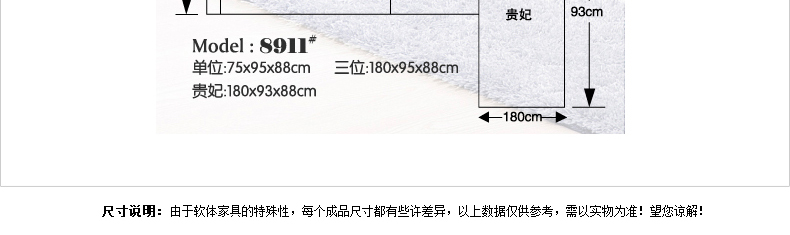 外围尺寸; 3人位:180*95*88cm 单人位:75*95*88cm 贵妃: 180*93*88cm