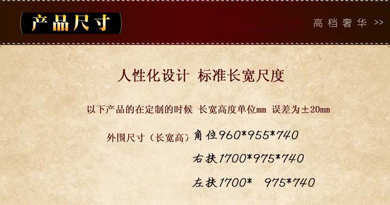 外围尺寸:左扶手1700mm*975mm*740mm,有扶手1700mm*975mm*740mm,转角位960mm*955mm*740mm(长*宽*高)