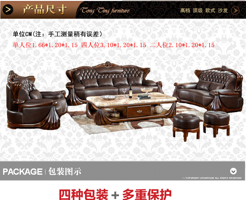 外围尺寸: 单人沙发 1.66*1.20*1.15 双人沙发 2.10*1.20*1.15 四人沙发 3.10*1.20*1.15 长几(进口黑龙) 2.0*1.0 方几 (进口黑龙) 0.85*0.85