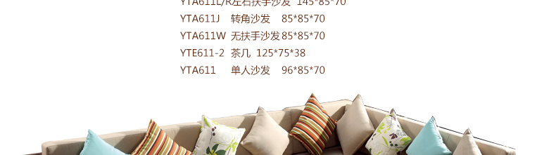 YTA611L/R左右扶手沙发145*85*70 YTA611J转角沙发85*85*70 YTA611W无扶手沙发85*85*70 YTE611-2茶几125*75*38 YTA611单人沙发96*85*70