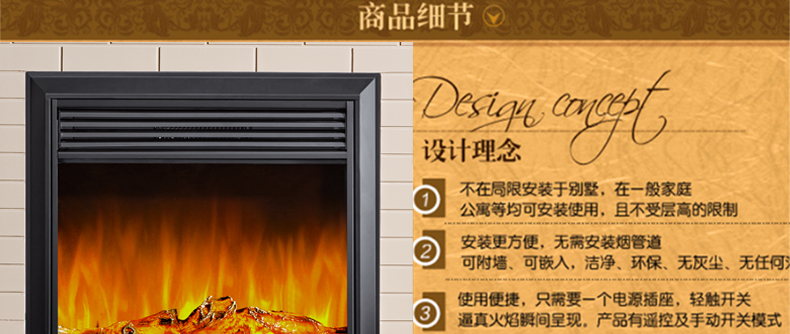 壁炉具有清洁卫生安全可靠装卸便利燃烧利用率高等特点;壁炉不仅能节省取暖成本,还可以带来高雅的观赏效果.安全便利的享受壁炉所带来的温馨和舒适.轻触开关,神奇的火焰效果瞬间展现.华美的火焰将为您居家装潢带来美丽的心情.嵌入式和独立式电壁炉给房间带来温馨和舒适.