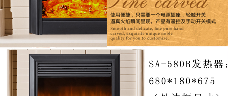尺寸: 壁炉外框+装饰炉芯:1500*320*1100 ST-700B装饰炉芯:725*170*700; SA-580B发热器:680*180*675(外边框) 580*180*615(内边框)