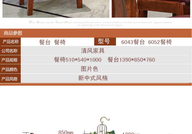清风 实木家具 餐厅餐台餐桌椅 新中式风格6043餐台6052餐椅