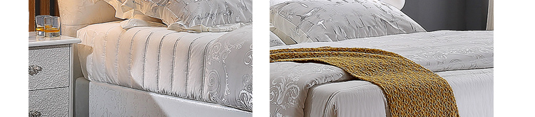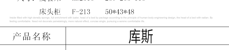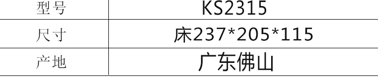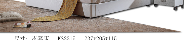 外围尺寸:皮套床KS2315:237*205*115;床头柜F-213:50*43*48;床品C2315棉笠六件套。