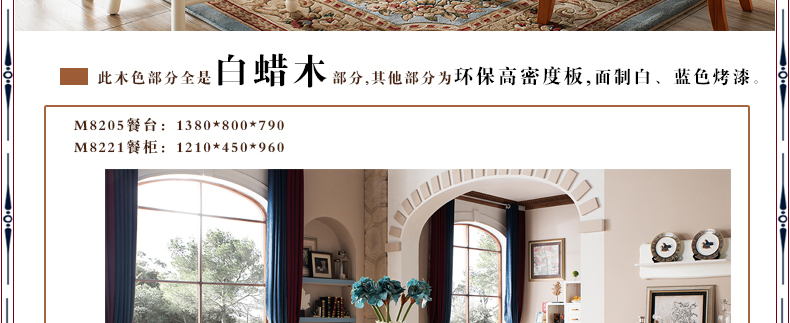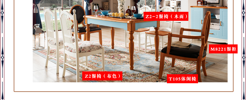 外围尺寸: M8203 餐台: 1380*800*790 M8221 餐柜: 1210*450*960 Z2 餐椅(布色): 1000*470*470 Z2-2 餐椅(木面): 1000*470*470 T105 休闲椅: 980*680*580