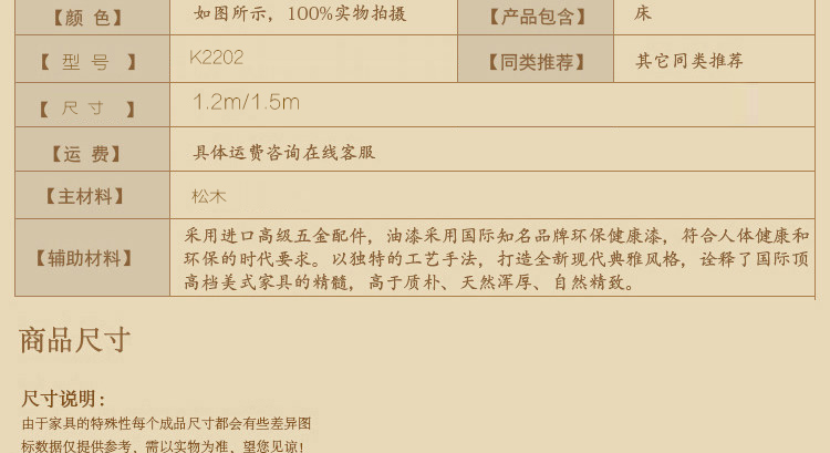外围尺寸:K2202双层床1.2m2050*1310*1910; K2202双层床1.5m2050*1610*1910; F2-12气动床箱1895*1204*328; DG202拖斗1895*610*246; DG203拖床1886*1050*234。