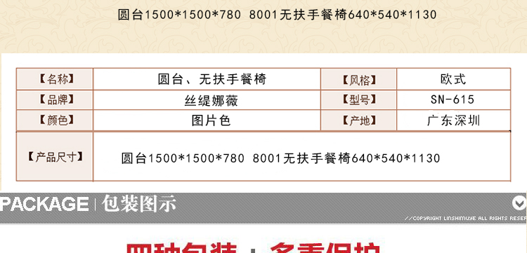 外围尺寸(长*宽*高):圆台1500*1500*780 8001无扶手餐椅640*540*1130mm