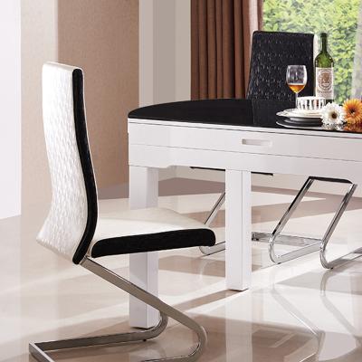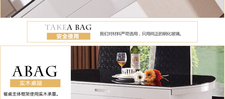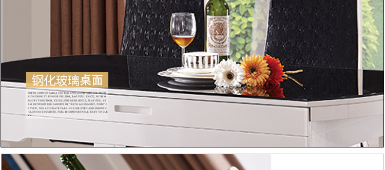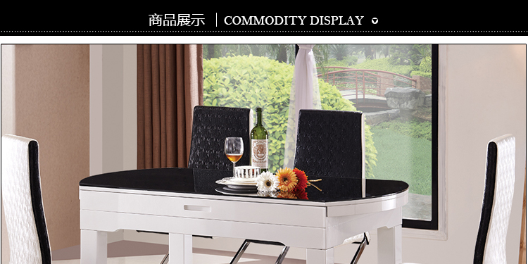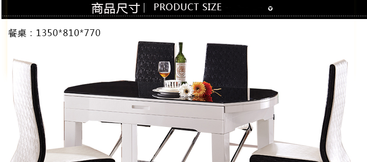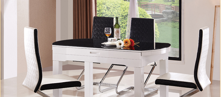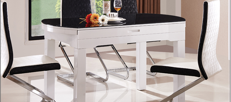 橡胶木主框架、黑色钢化玻璃、拉伸功能餐台