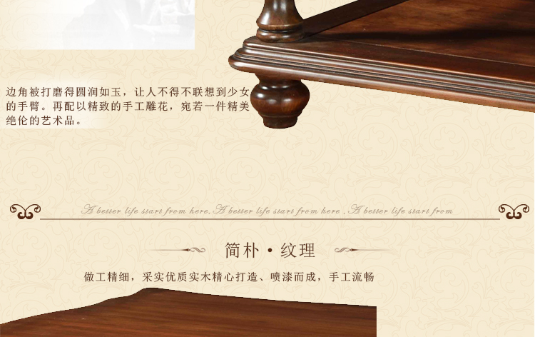 美式古老工艺技法,精雕细琢,完美极致。传达出美式风格的实木家具。木板采用的都是100%实木,防潮防腐防蛀超环保。木艺家具浑厚沉实、明朗高尚的独特韵味及风格。让您的家独具一格!