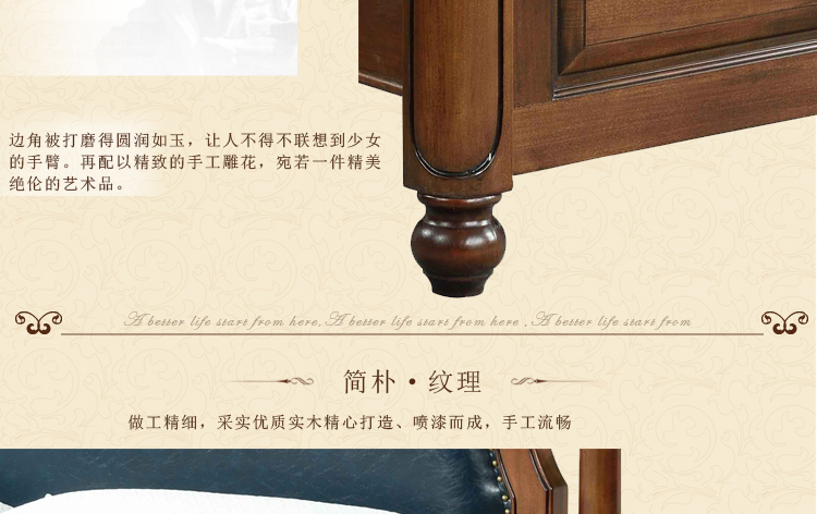 美式古老工艺技法,精雕细琢,完美极致。传达出美式风格的实木家具。木板采用的都是100%实木,防潮防腐防蛀超环保。木艺家具浑厚沉实、明朗高尚的独特韵味及风格。让您的家独具一格!