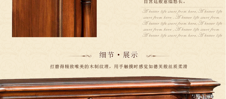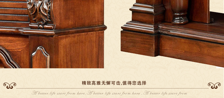 美式古老工艺技法,精雕细琢,完美极致。传达出美式风格的实木家具。木板采用的都是100%实木,防潮防腐防蛀超环保。木艺家具浑厚沉实、明朗高尚的独特韵味及风格。让您的家独具一格!