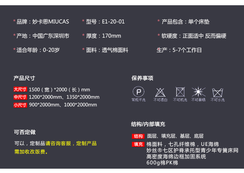 MIUCAS/妙卡思定制1.2米儿童床垫1.5双人环保0甲醛弹簧席梦思学生E1-20-01