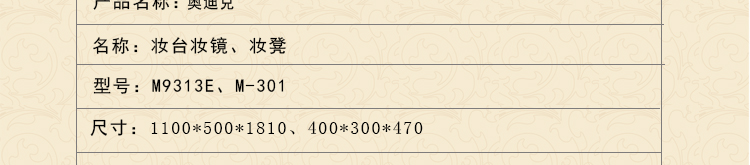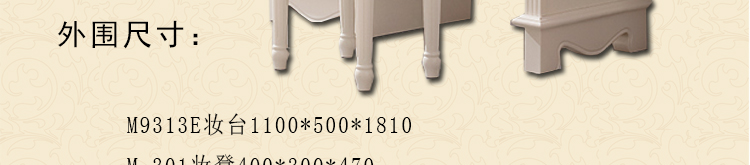 外围尺寸:M9313E妆台1100*500*1810; M-301通用妆凳400*300*470。