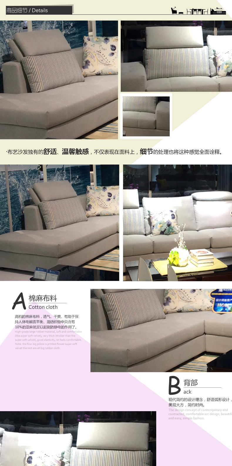 极至简约风格 创造不一样的家 全新的设计 优质的棉麻面料 畅想高品质生活——【棉麻面料】具有耐磨透气、舒适柔软、防虫防螨。【实木骨架】烘干木方,防潮、结实耐用、承重力强;【适用场所】高档公寓、书房、客厅、卧室、办公室、酒店、咖啡厅、门店等
