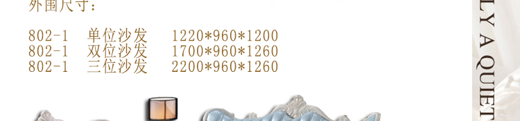 外围尺寸:802-1 单位沙发1220*960*1200; 802-1双位沙发1700*960*1260; 802-1三位沙发2200*960*1260。