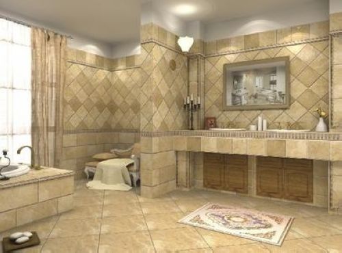 瓷砖拼贴方法的变化多端使浴室也呈现多样的变幻,色彩的配合运用、形状的多样搭配、装饰线条的精心设计都赋予浴室全新的感觉。