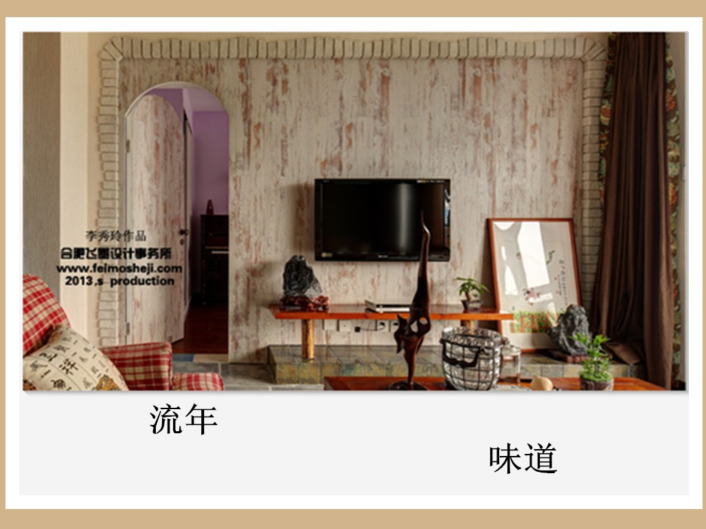 在立面材质处理上,大多以手工材料为主,电视墙的沧桑映衬着小红格沙发的细腻.