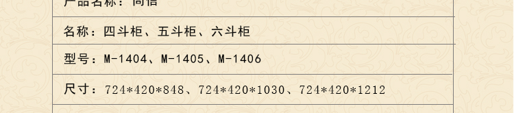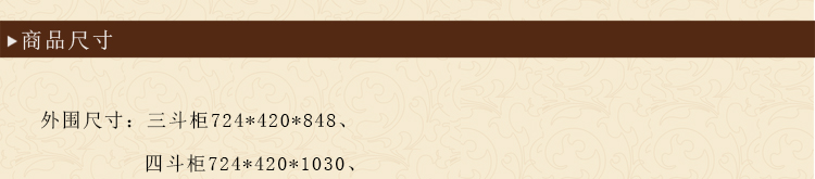 外围尺寸:四斗柜724x420x848; 五斗柜724x420x1030; 六斗柜724x420x1212。