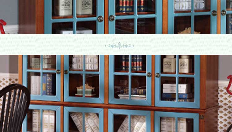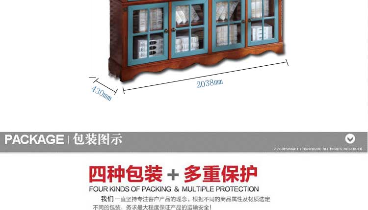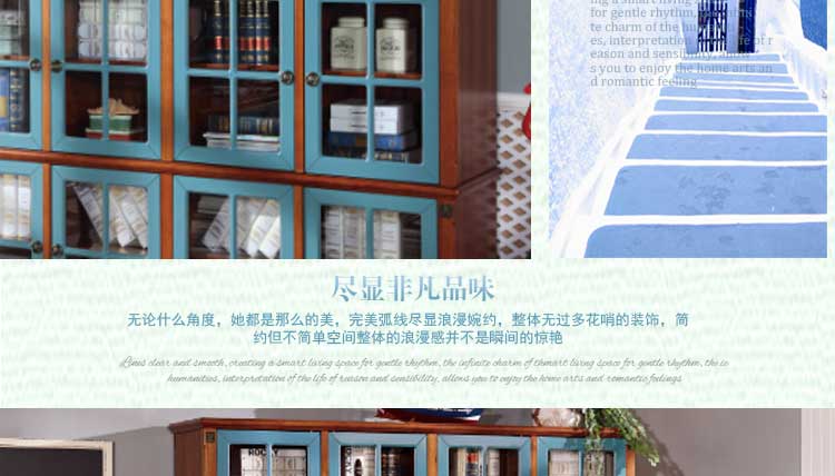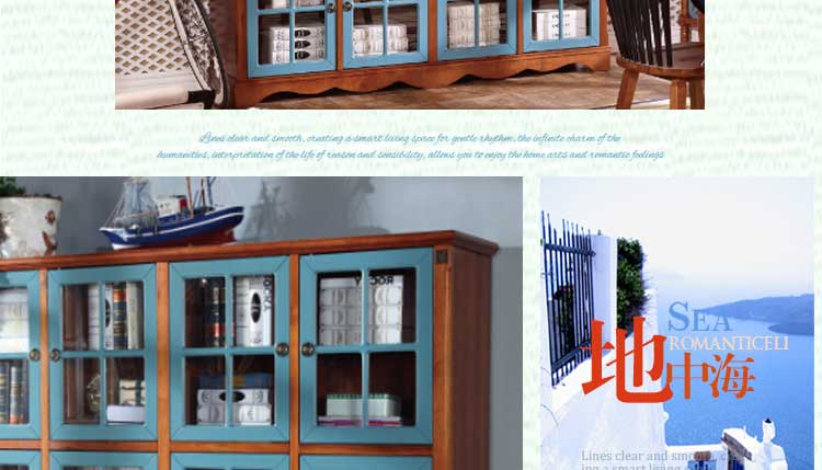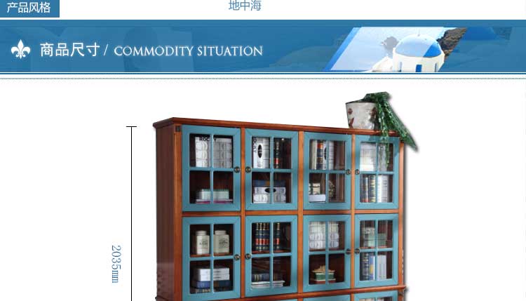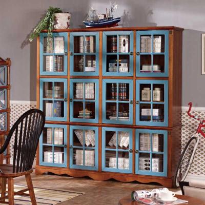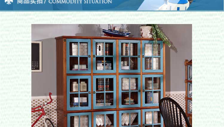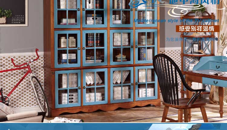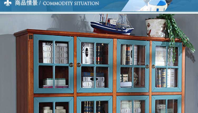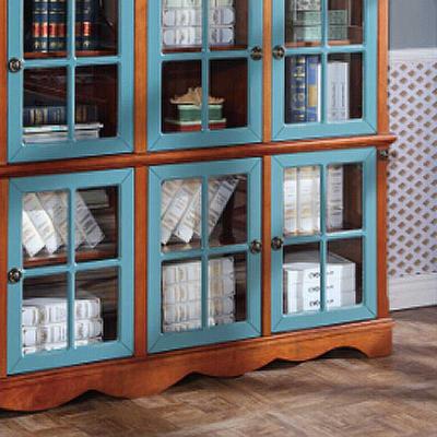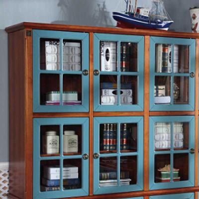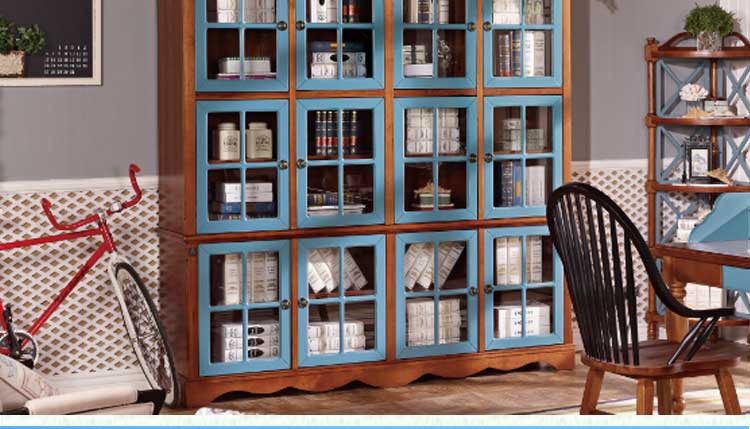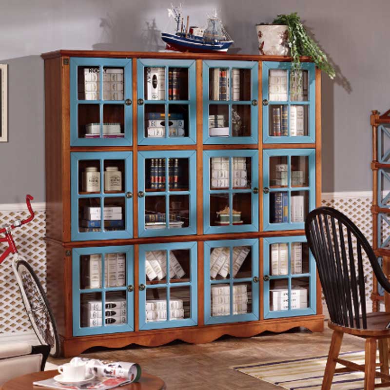 欧木轩地中海实木书柜 四门简易书架格子柜美式书橱玻璃门8GC03
