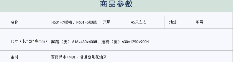 外围尺寸:H601-7摇椅(皮)630x1290x900H;F601-5 脚踏(皮)615x430x400H。