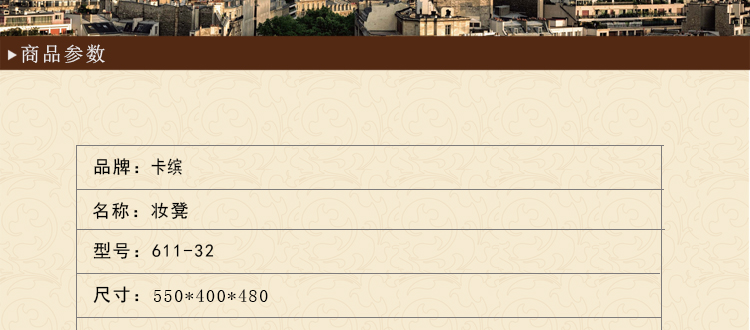 外围尺寸:611-32妆凳550*400*480(实木+布艺+布扣+铜钉)