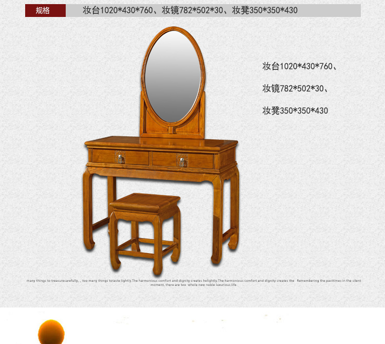 外围尺寸:Z-M01妆台1020*430*760、ZJ-M01妆镜782*502*30、ZD-M01妆凳350*350*430。