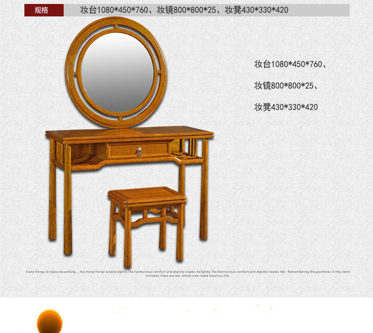 外围尺寸:Z-Y01妆台1080*450*760、ZJ-Y01妆镜800*800*25、ZD-Y01妆凳430*330*420。