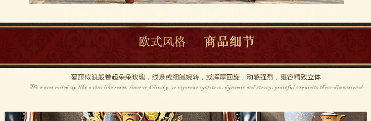 柔和的色调,大气典雅的外形,精巧的装饰点缀着每一个细节,隐隐浮现含蓄与稳重,撩拔着一种新的生活姿态,追求一种繁复夸饰,富丽堂皇,气势宏大,富于动感的艺术境界。高贵的生活品质,雍容华贵的内在气息,张扬的造型征服心灵,延续欧式的浪漫与精致!