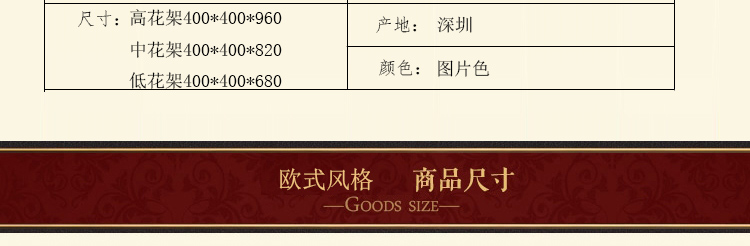 外围尺寸:A66高花架400*400*960mm、 A66中花架400*400*820mm、 A66低花架400*400*680mm。
