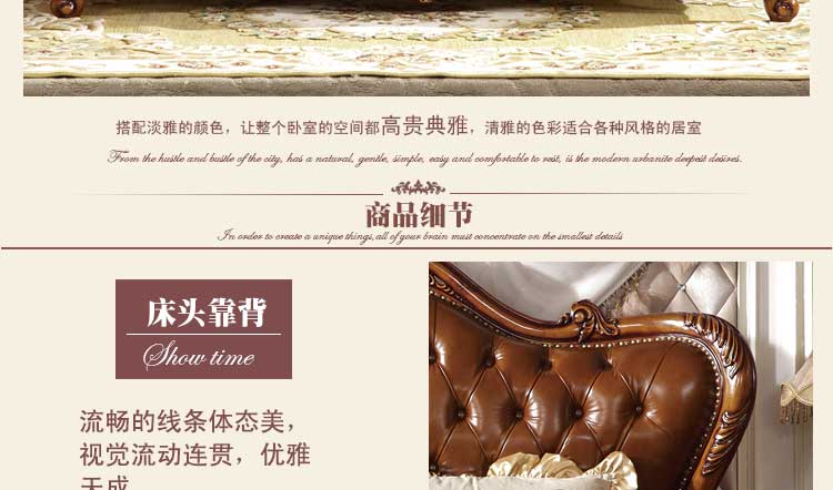 柔和的色调,大气典雅的外形,精巧的装饰点缀着每一个细节,隐隐浮现含蓄与稳重,撩拔着一种新的生活姿态,追求一种繁复夸饰,富丽堂皇,气势宏大,富于动感的艺术境界。高贵的生活品质,雍容华贵的内在气息,张扬的造型征服心灵,延续欧式的浪漫与精致!