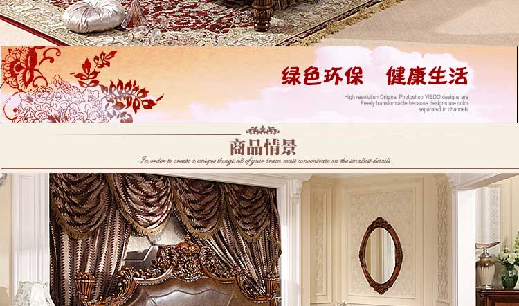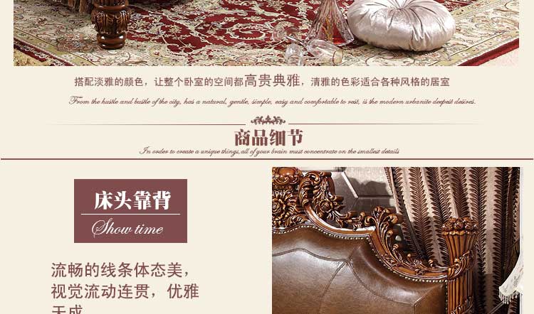 柔和的色调,大气典雅的外形,精巧的装饰点缀着每一个细节,隐隐浮现含蓄与稳重,撩拔着一种新的生活姿态,追求一种繁复夸饰,富丽堂皇,气势宏大,富于动感的艺术境界。高贵的生活品质,雍容华贵的内在气息,张扬的造型征服心灵,延续欧式的浪漫与精致!