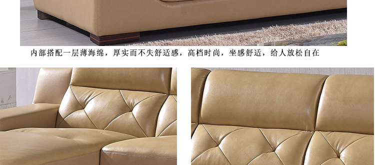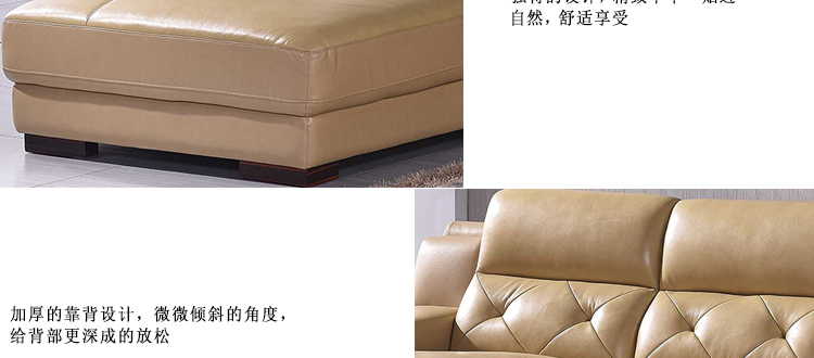 沙发皮质很好,手感舒适柔软,质地细腻。颜色漂亮耐脏。而且框架结构结实,沙发材质环保无味,总体大气时尚,性价比好。