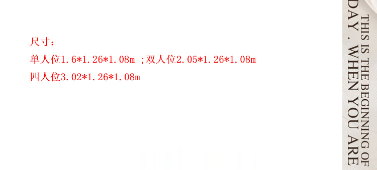 尺寸:单位沙发:1.6*1.26*1.08;二位沙发:2.05*1.26*1.08;四位沙发:3.02*1.26*1.08