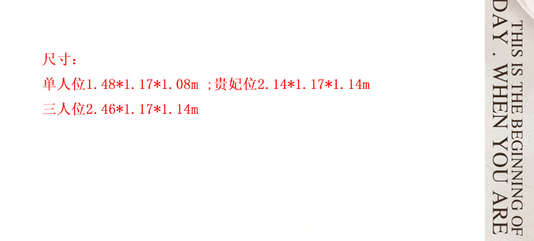 尺寸:单位沙发:1.48*1.17*1.08;贵妃位:2.14*1.17*1.14;三位沙发:2.46*1.17*1.14
