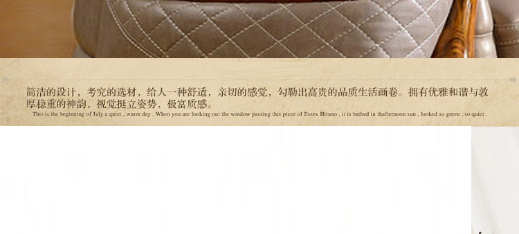 沙发质量还不错,上等皮子,框架很结实,款式新颖大方,做工精致,店家发货速度快,包装严实,非常的喜欢。