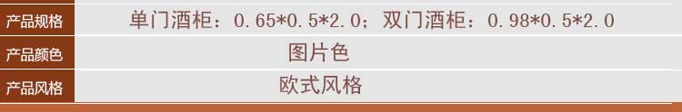 尺寸:单门酒柜:0.65*0.5*2.0;双门酒柜:0.98*0.5*2.0;中地柜:2.0*0.5*0.6