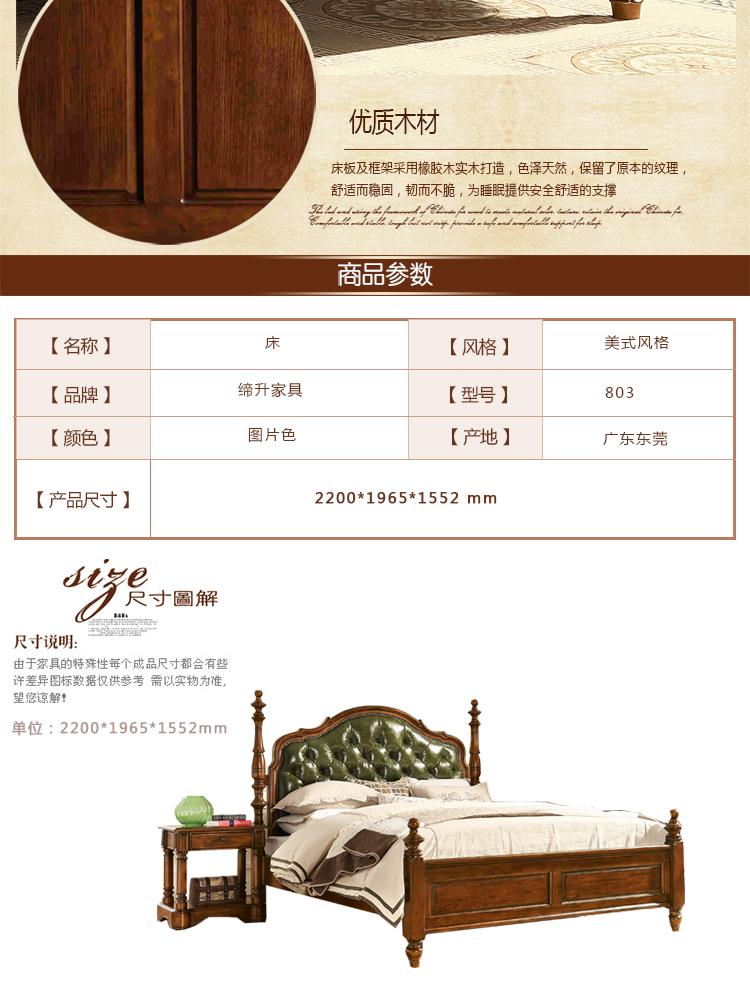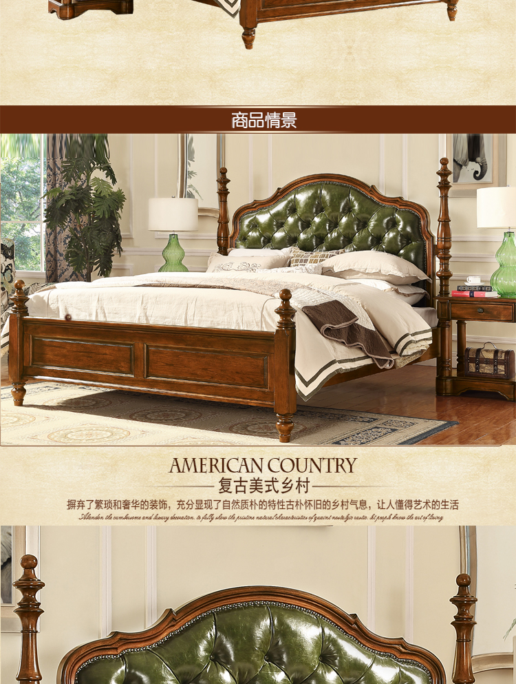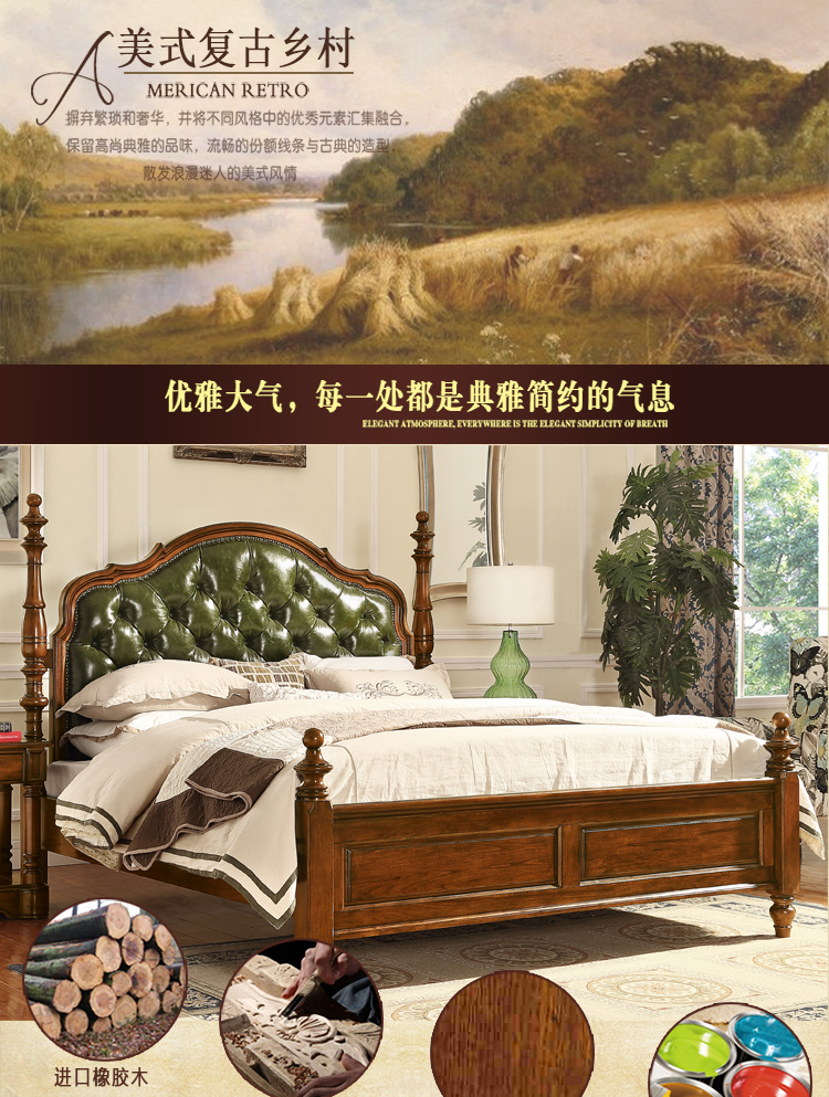 缔升家具 美式床 复古乡村美式皮艺木质床 宜家卧室双人床 803