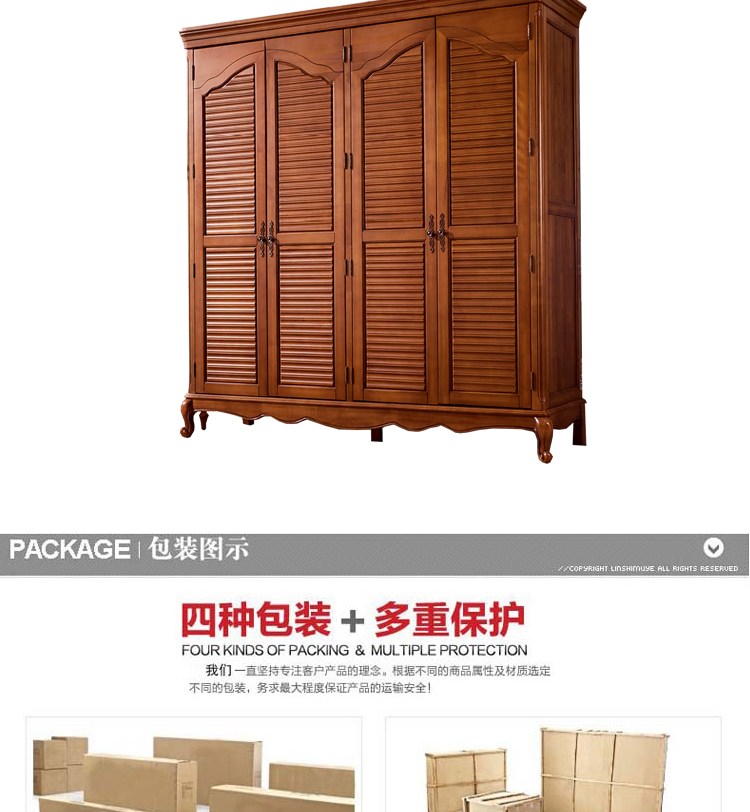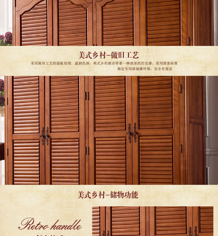 雅庭罗兰 美式乡村移门衣橱四门大衣 美式衣柜实木推拉门衣柜 68102