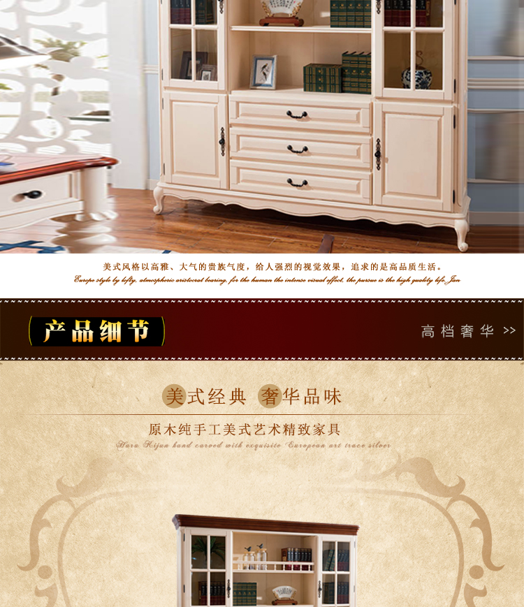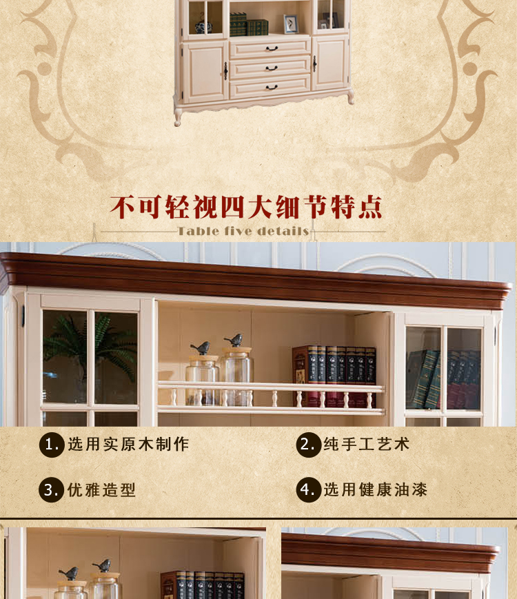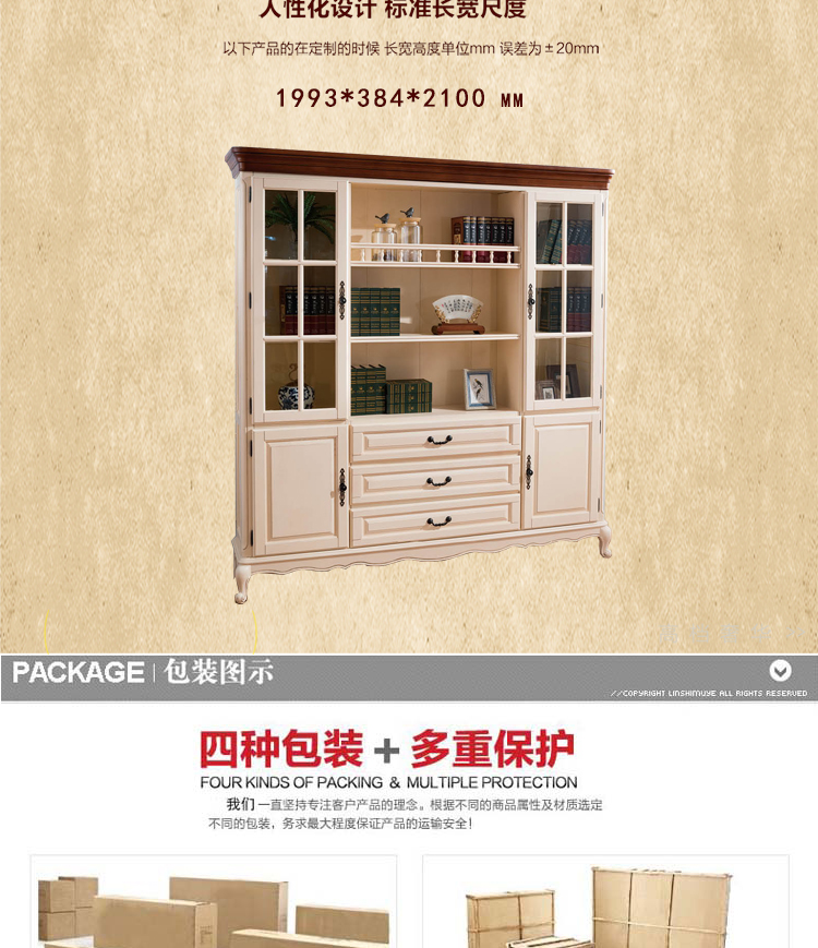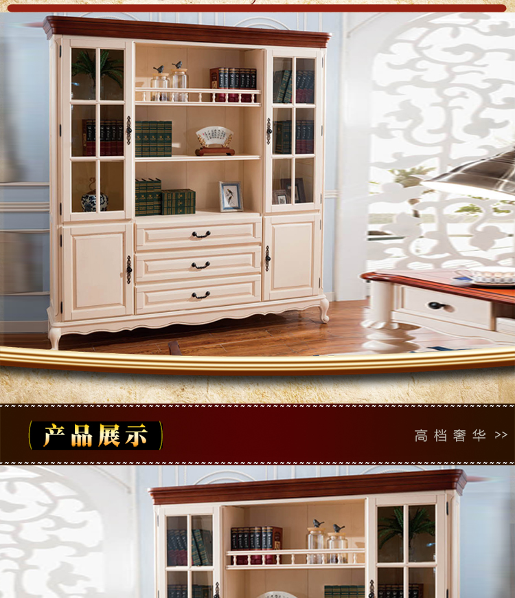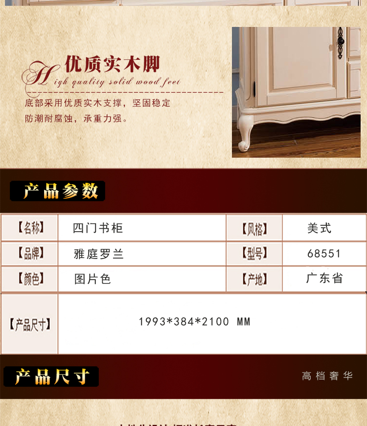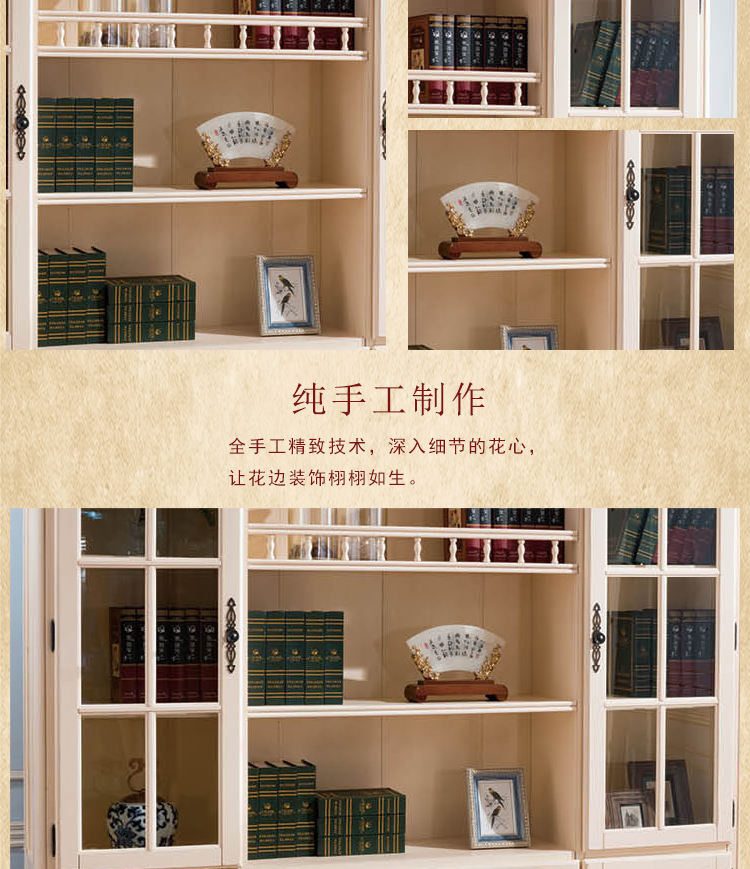雅庭罗兰 美式乡村白色四门书柜 高档书房四门书柜 儿童书柜 68551