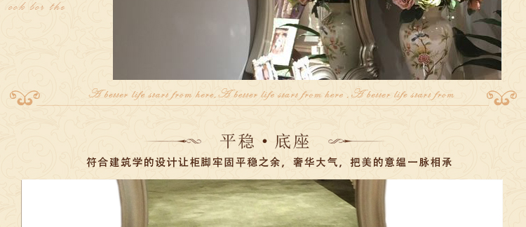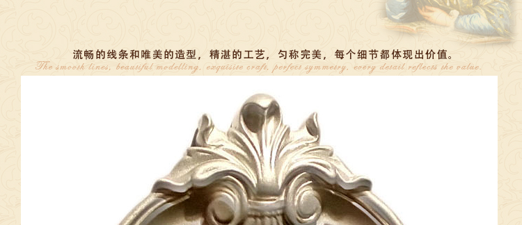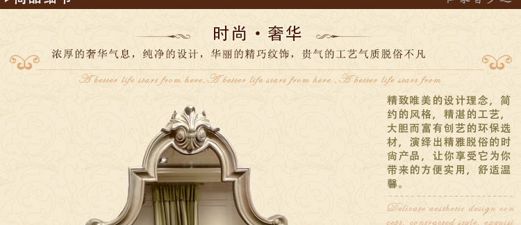 法式家具十分推崇优雅、高贵和浪漫,它是一种基于对理想情景的考虑,追求建筑的诗意、诗境,力求在气质上给人深度的感染。艺术风格最集中体现在家具的设计方面,要特征在于布局上突出轴线的对称,恢宏的气势,高贵典雅。细节处理上注重雕花、线条,制作工艺精细考究。