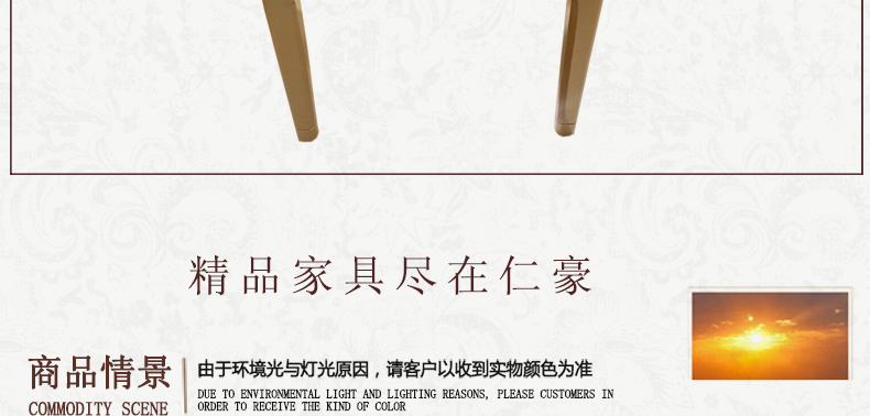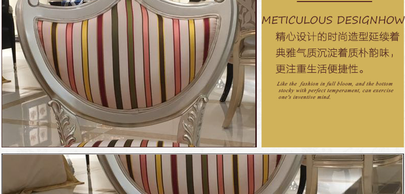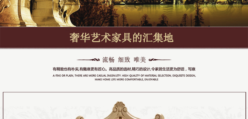法式家具十分推崇优雅、高贵和浪漫,它是一种基于对理想情景的考虑,追求建筑的诗意、诗境,力求在气质上给人深度的感染。艺术风格最集中体现在家具的设计方面,要特征在于布局上突出轴线的对称,恢宏的气势,高贵典雅。细节处理上注重雕花、线条,制作工艺精细考究。
