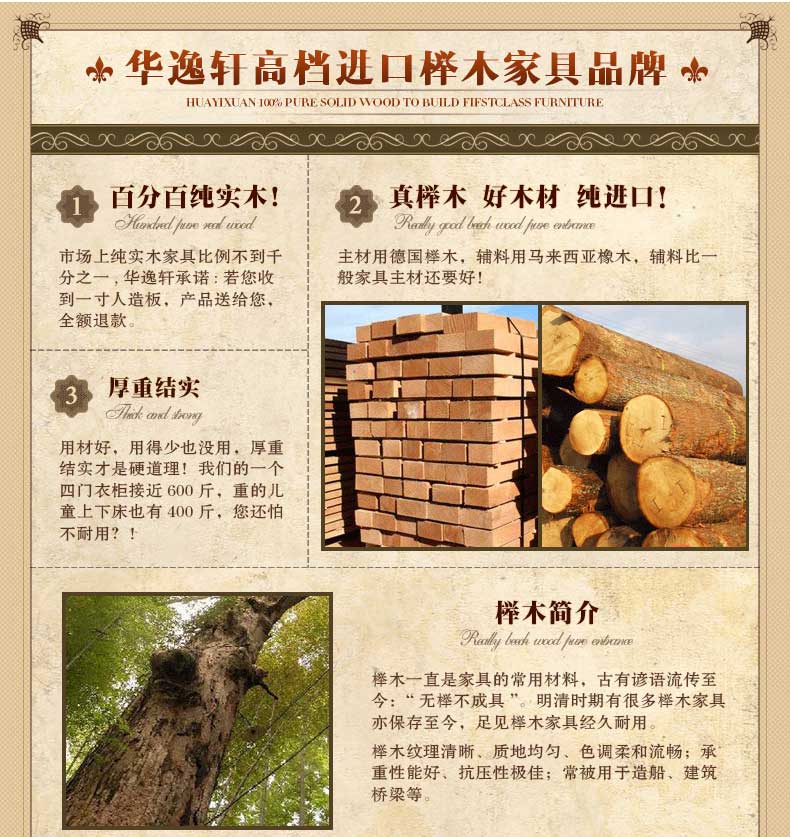 选用材料100%绿色环保,健康无忧环保零甲醛,产品均通过国家质检认证。全进口实木,厚重结实,不贴皮。朴实简洁不华丽,没有繁多琐碎的花式设计,满屋温和的原木色家居,打造一个时尚完美的家。