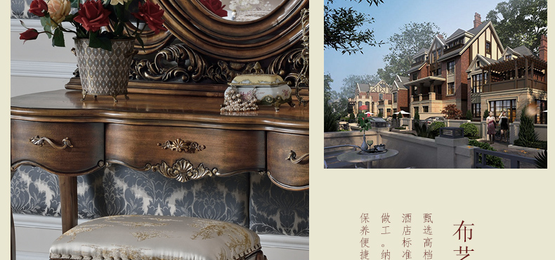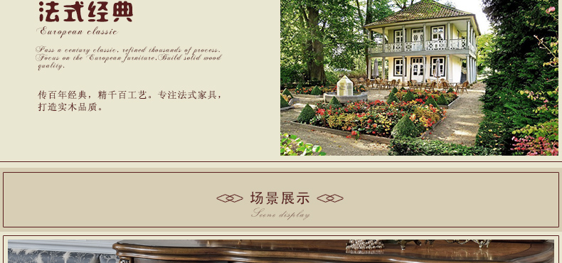 法式家具十分推崇优雅、高贵和浪漫,它是一种基于对理想情景的考虑,追求建筑的诗意、诗境,力求在气质上给人深度的感染。艺术风格最集中体现在家具的设计方面,要特征在于布局上突出轴线的对称,恢宏的气势,高贵典雅。细节处理上注重雕花、线条,制作工艺精细考究。