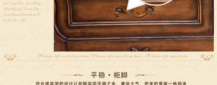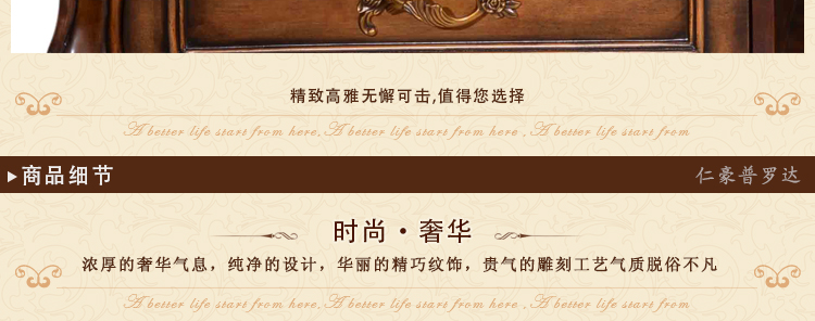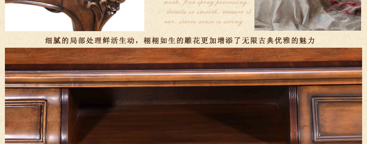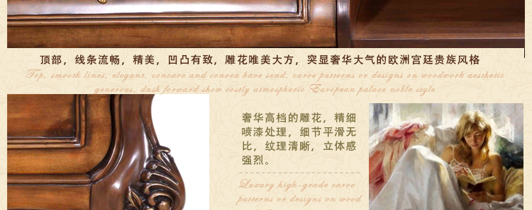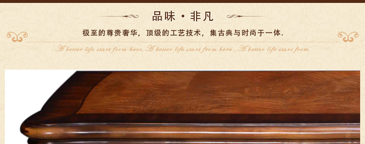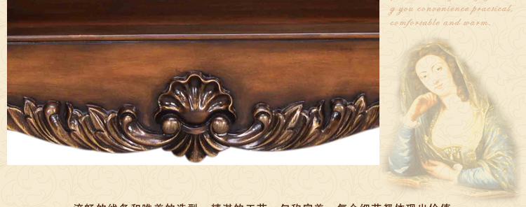 法式家具十分推崇优雅、高贵和浪漫,它是一种基于对理想情景的考虑,追求建筑的诗意、诗境,力求在气质上给人深度的感染。艺术风格最集中体现在家具的设计方面,要特征在于布局上突出轴线的对称,恢宏的气势,高贵典雅。细节处理上注重雕花、线条,制作工艺精细考究。