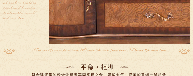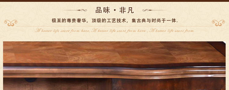 法式家具十分推崇优雅、高贵和浪漫,它是一种基于对理想情景的考虑,追求建筑的诗意、诗境,力求在气质上给人深度的感染。艺术风格最集中体现在家具的设计方面,要特征在于布局上突出轴线的对称,恢宏的气势,高贵典雅。细节处理上注重雕花、线条,制作工艺精细考究。
