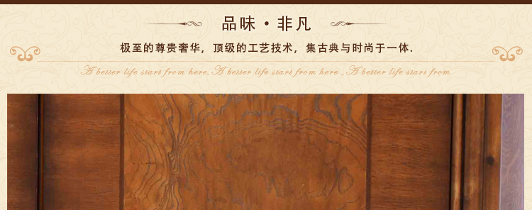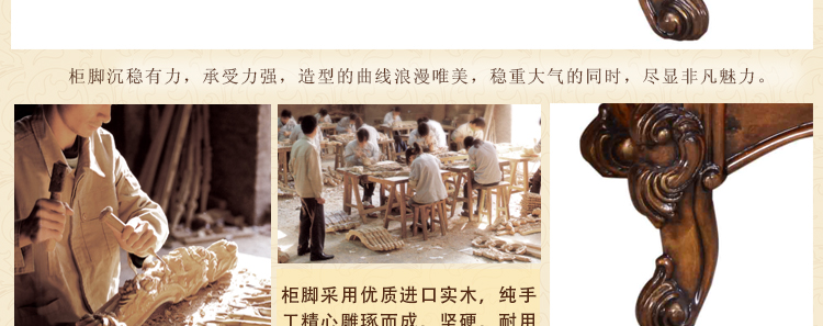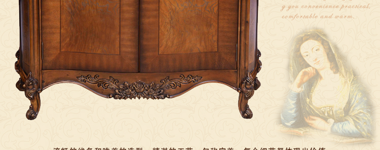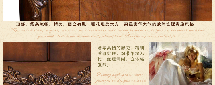 法式家具十分推崇优雅、高贵和浪漫,它是一种基于对理想情景的考虑,追求建筑的诗意、诗境,力求在气质上给人深度的感染。艺术风格最集中体现在家具的设计方面,要特征在于布局上突出轴线的对称,恢宏的气势,高贵典雅。细节处理上注重雕花、线条,制作工艺精细考究。