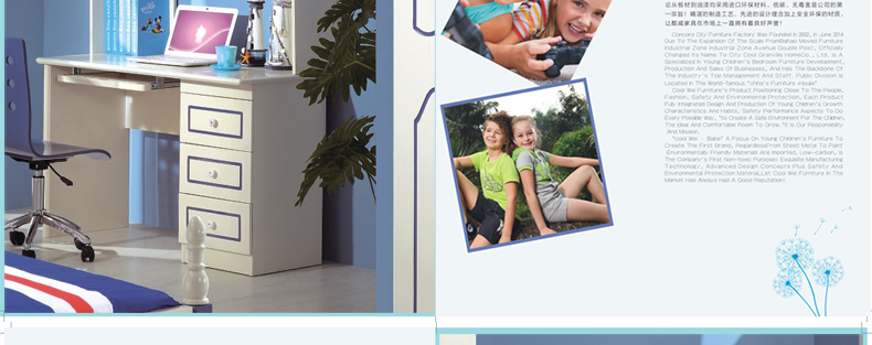 产品定位亲民、时尚、安全环保,每一款产品的设计和生产充分结合青少年儿童的成长特点和生活习惯,安全性能方面做到无微不至,“为孩子创造安全环保,理想舒适的成长空间”是我们的责任和使命。