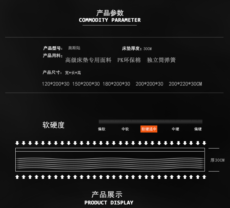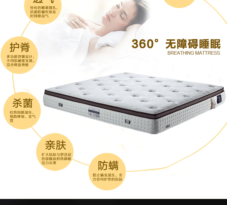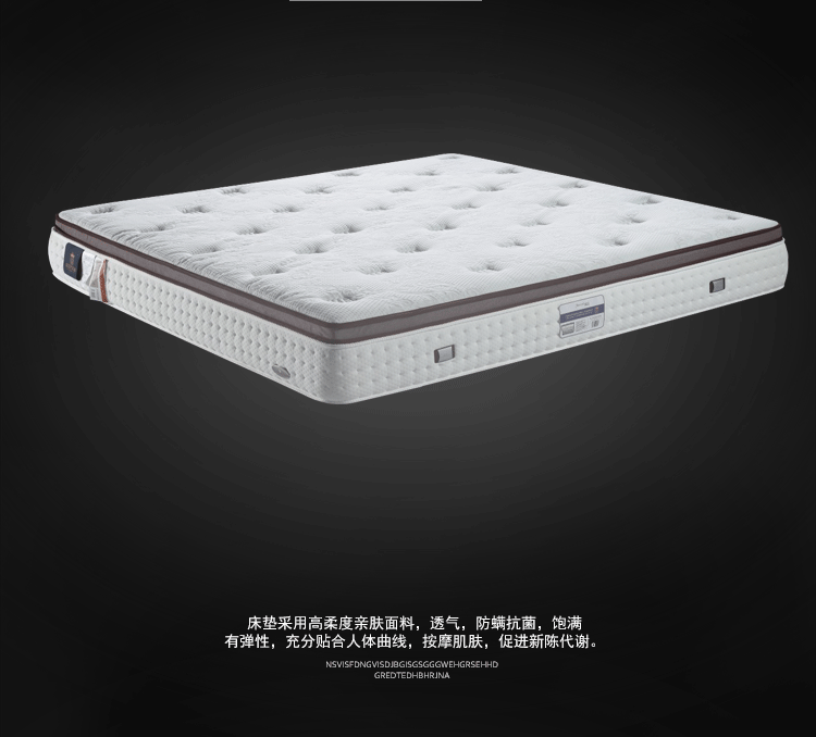 高级透气面料,抗菌防螨,排除潮气,全方位调节压力,在睡眠中促进血液循环,多功能弹簧可以完全释放脊椎,扩大肌肤与舒适层的接触面积,将睡眠压力化零